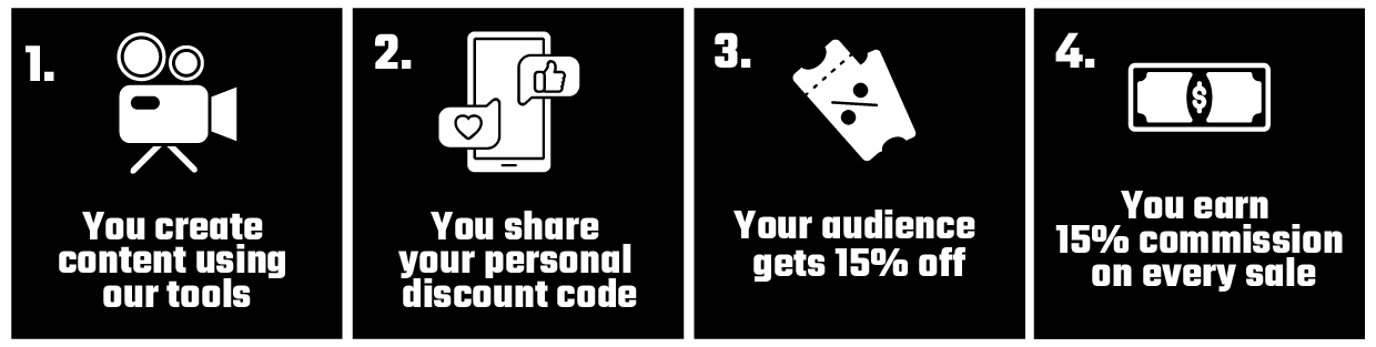 You’ll receive a personal promo code that gives your audience 15% off and earns you 15% commission on every sale generated through it.